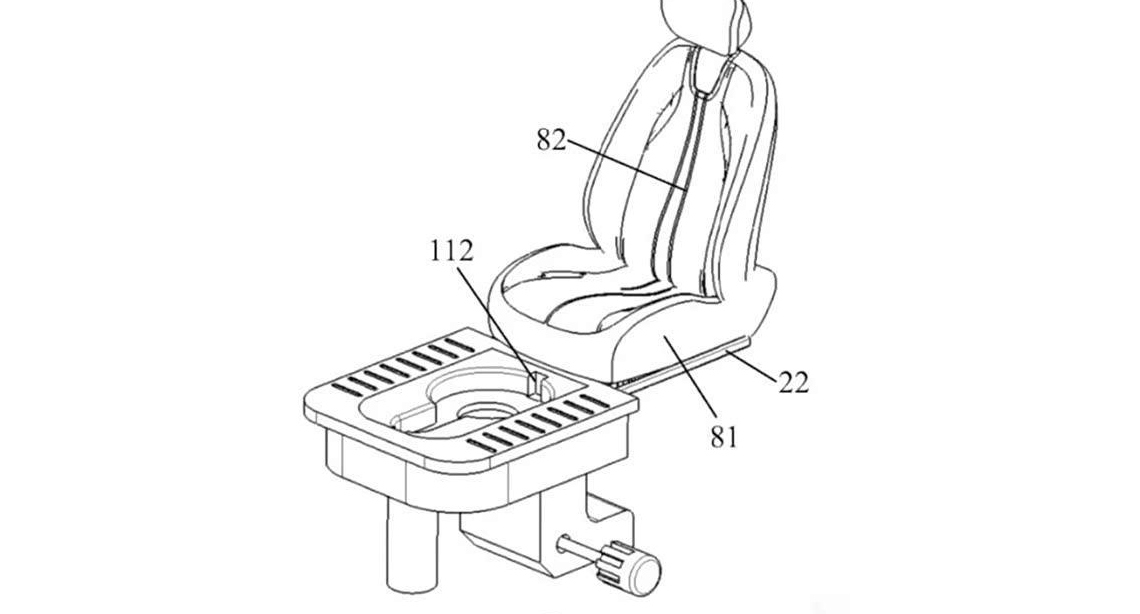 The hidden toilet utilizes a drawer-style sliding rail structure, which can be pulled out manually or deployed via voice command. To manage hygiene and odors, the patent includes a dedicated fan exhaust system that vents smells outside the vehicle. Furthermore, it features a heating element designed to dry solid waste and evaporate liquids, with the remaining waste stored in a removable tank that requires manual emptying.